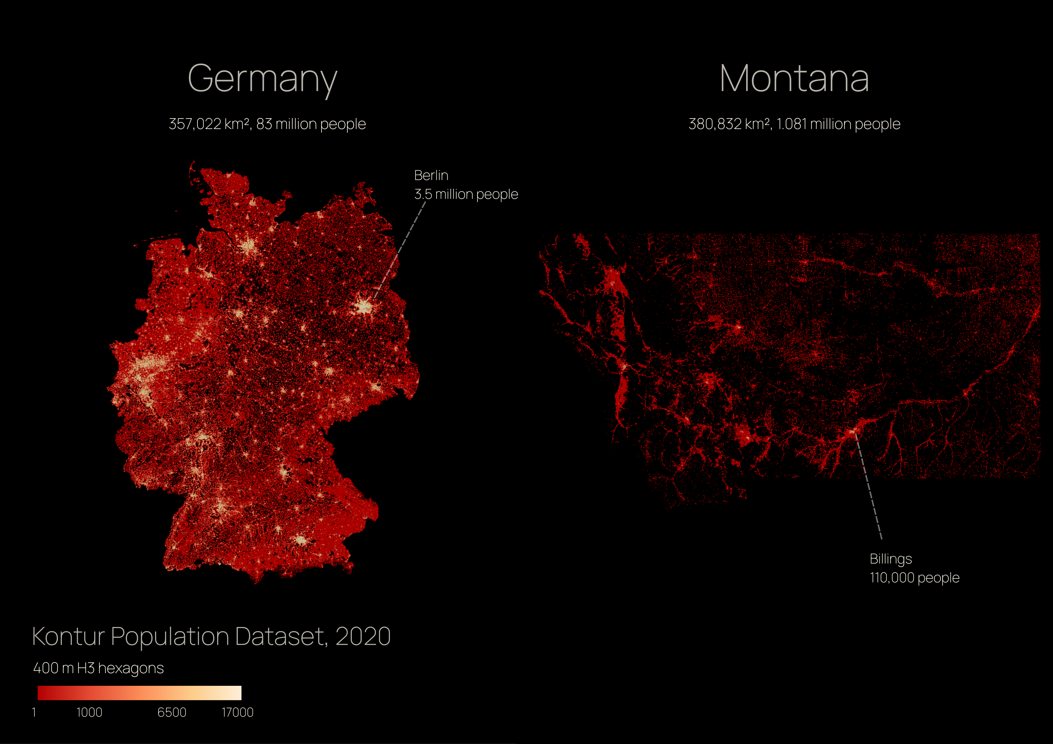These maps visualize the differences between Germany and Montana, which have similar areas but different population densities. Both use the Kontur population dataset.