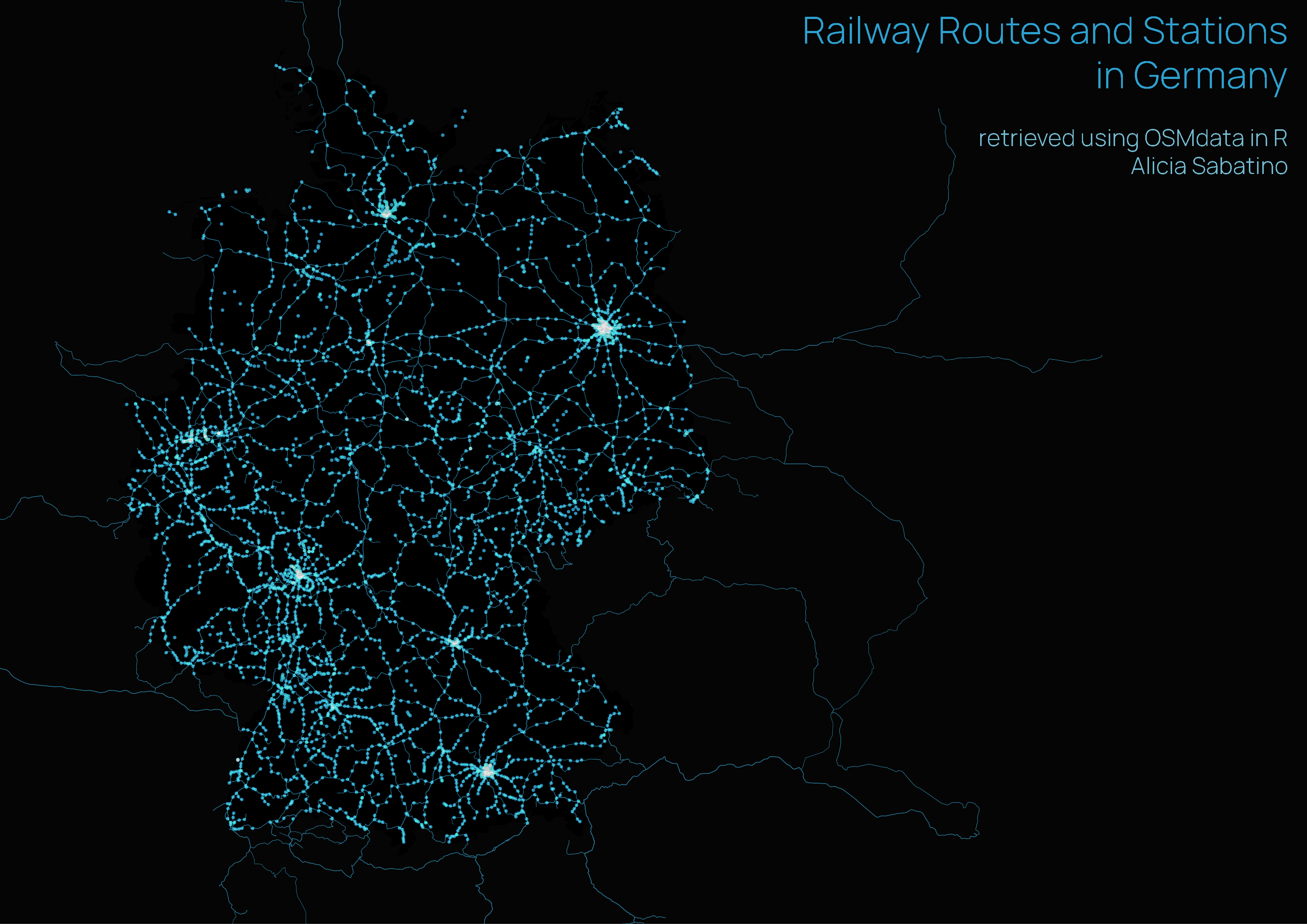 This map shows all the railway stations and routes in Germany. This data was retrieved through the OSMdata package in R.